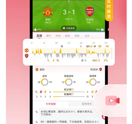 2. 实时的比分直播和文字直播:875直播足球体育app提供全程实时的足球比分直播和文字直播,让用户能够第一时间掌握比赛进展和结果。不论是在赛场上还是在工作中,用户都可以随时随地了解比赛最新动态。