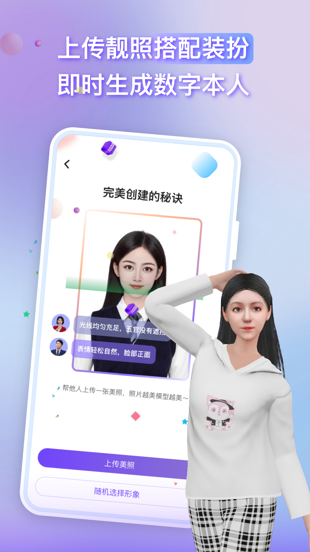 #数字本人在线聊天,好友实时同屏互动 在这里你还可以通过你的数字本人进行社交聊天,不仅增加好友之间的互动交流,更将数字空间中熟悉的我们、陌生的我们都更紧密地联系在一起。