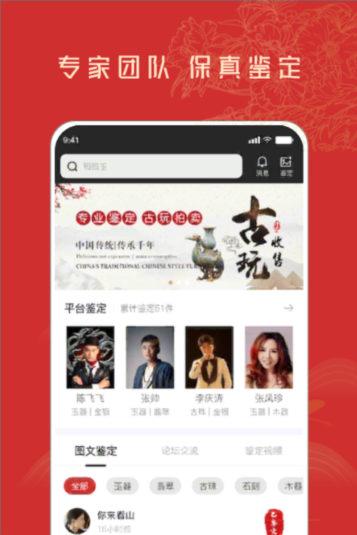 古玩介绍、鉴定结果、流行资讯、精彩视频等内容都支持分享,邀请好友一同交流,支持短视频、直播得交流方式。