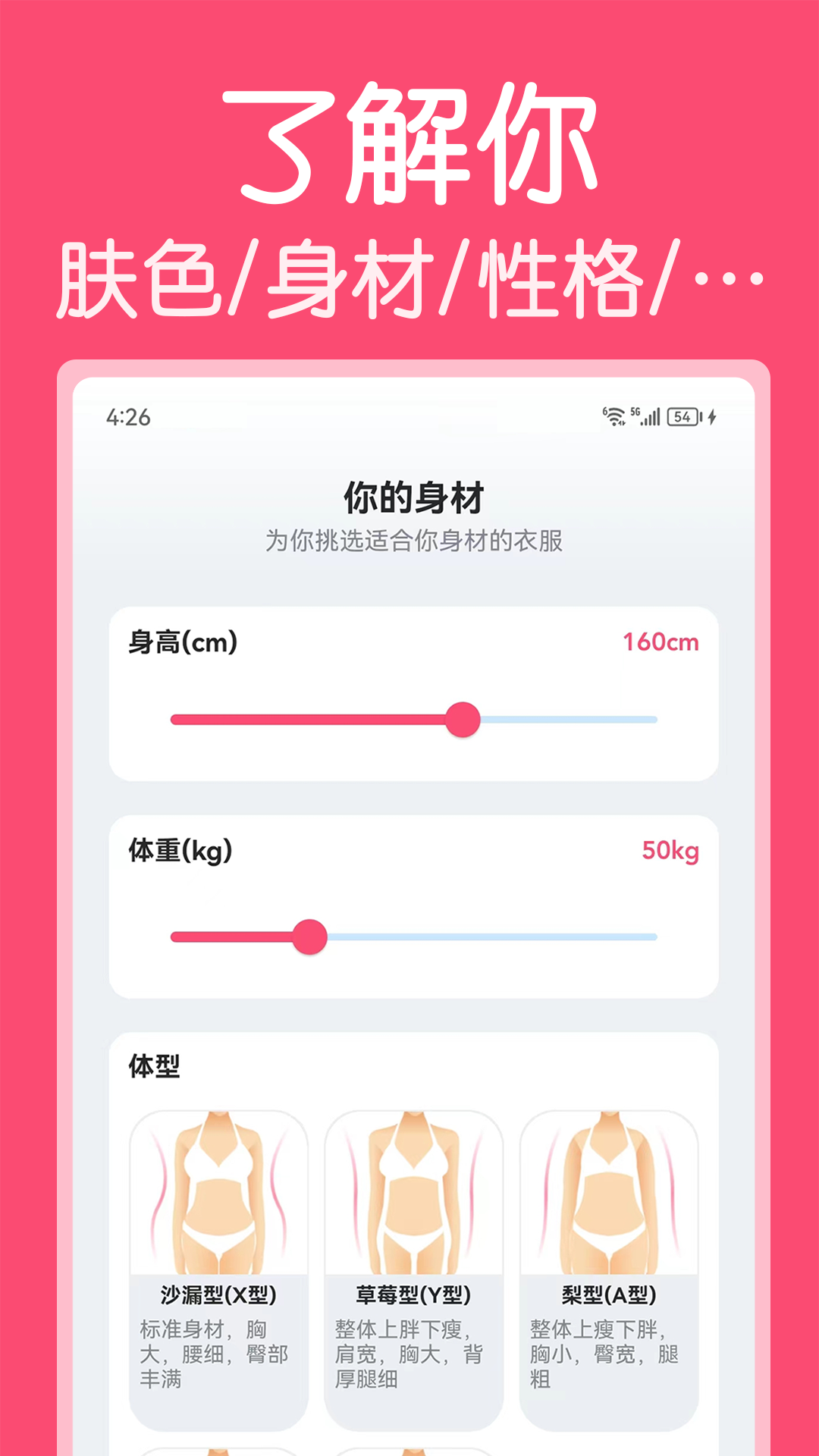 【个性化色彩搭配】根据您的肤色、发色、眉色、瞳色、唇色等,计算您的色彩特征,如明度、纯度、冷暖,并依据您的风格为您推荐服装色彩搭配,满足您对色彩搭配的需求;【多元风格搭配】考虑您的脸型、五官、体型、性格、爱好、职业等因素,为您量身打造最适合的搭配风格,涵盖优雅、自然、少女、少年、古典、浪漫、前卫等众多风格;