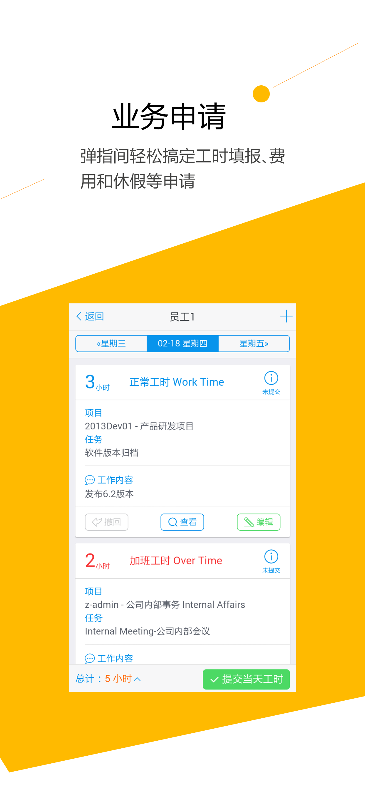 2. 工时填报 员工可以按天、按周及自定义的任意周期填报项目及非项目工时,并提交供审核。