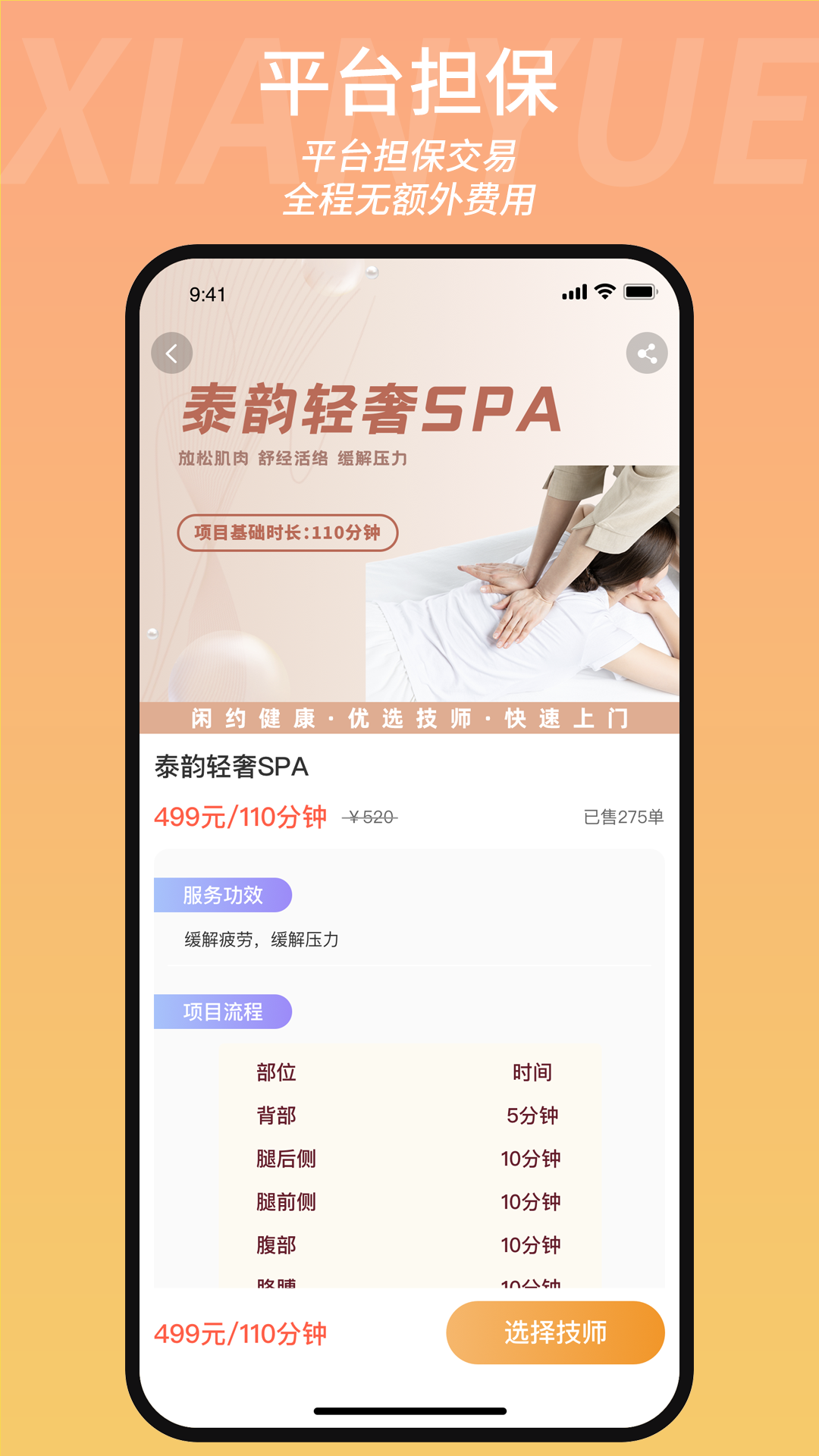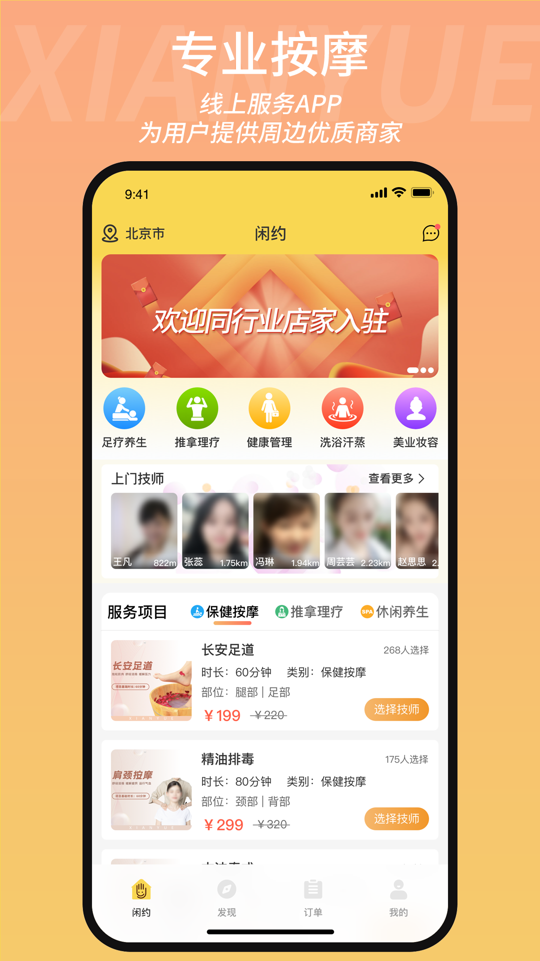 1、上门服务:选择您喜欢的按摩服务项目,预约技师在约定时间内上门服务。