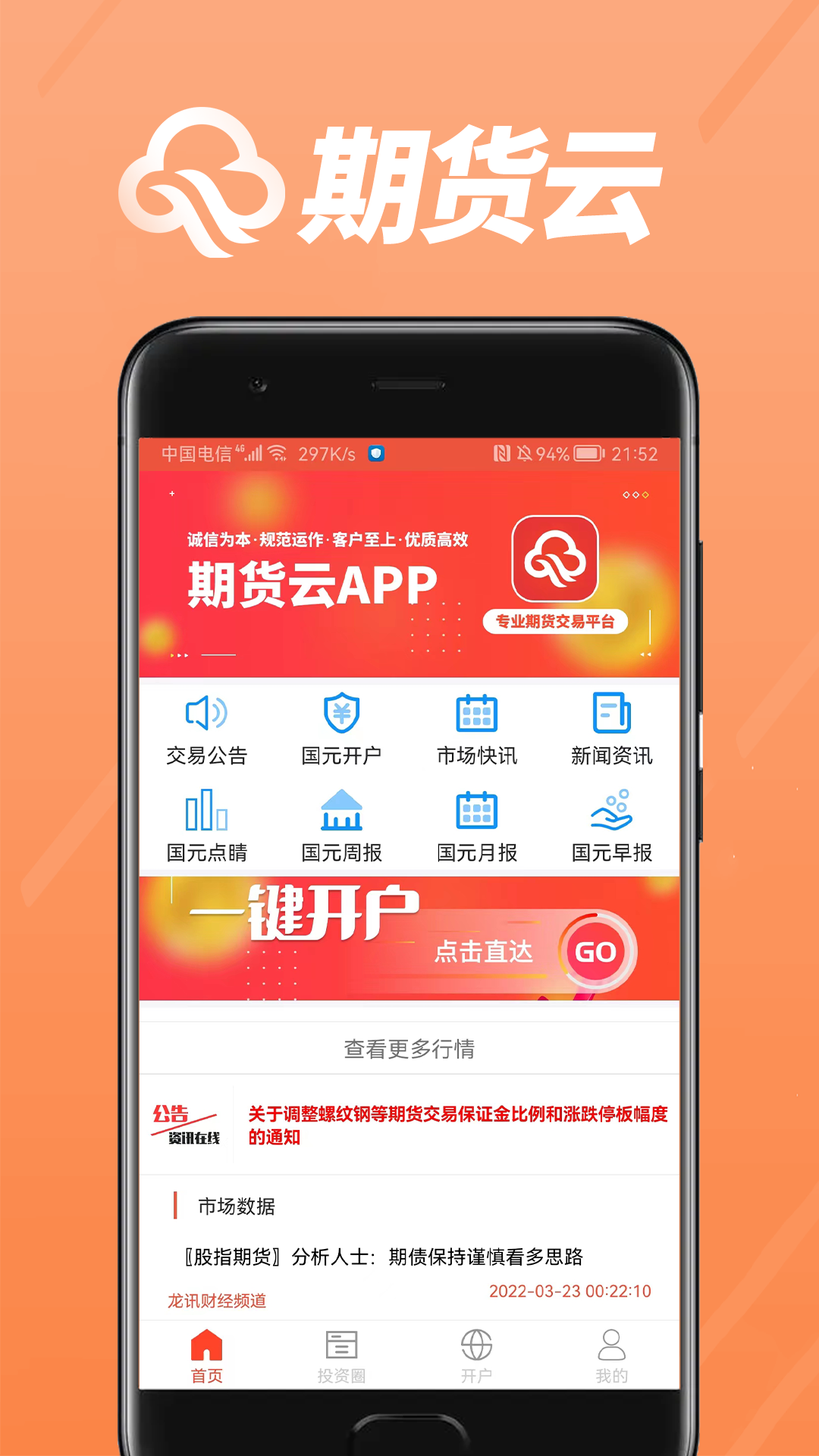 【期货云开户】内涵黄金,原油、股指期货等热门期货交易品种,是手机期货系统的创新与领先者。 软件是一款期货品种丰富,可以供不同投资者选择,其中包括了沪镍、黄金、白银、原油、螺纹钢、铁矿石、焦炭、焦煤、大豆、豆粕、橡胶、沪铜、白糖、沥青等国内、国际期货投资理财产品,同时提供国内外期货行情、资讯等给用户,还能够直接在手机上进行投资操作,方便快捷,使投资者能够随时抓住市场上的行情。软件实时的数据、动态提醒等功能让您快速迅捷地掌握瞬息万变的市场动态,实时的行情技术分析让您敏锐地识别转瞬即逝的市场机会。财神爷站提供期货云开户app官方版下载地址,有需要的用户可免费下载使用!