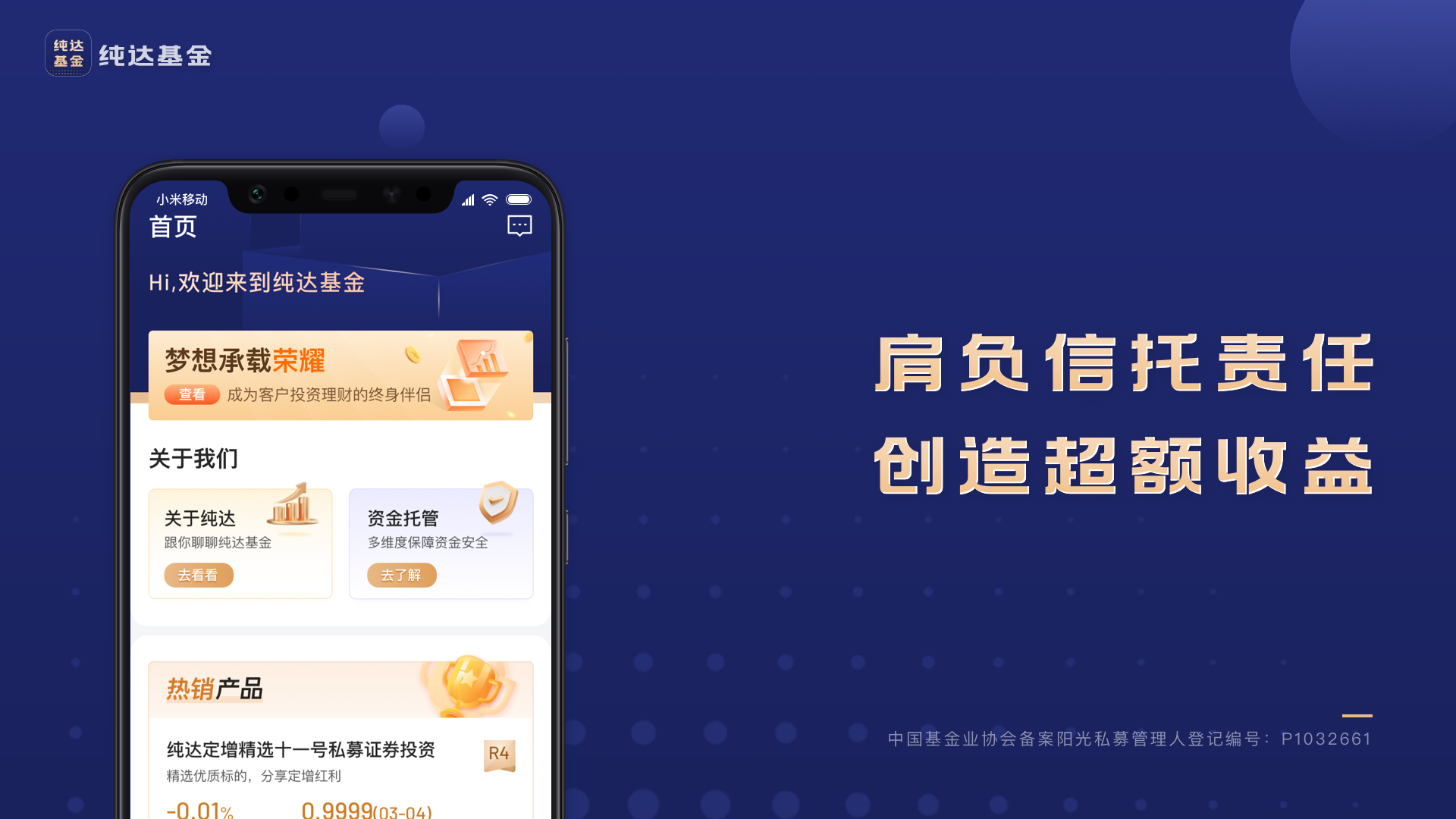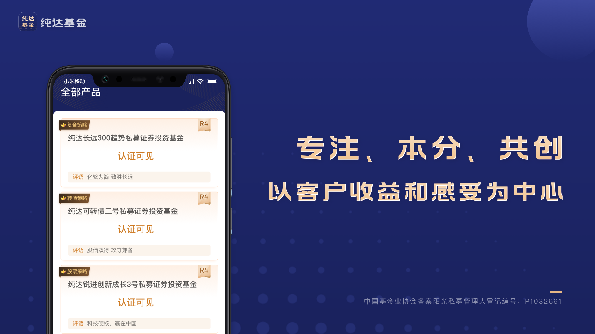 纯达概况上海纯达资产管理有限公司成立于2016年2月17日,是一家深耕证券二级市场的私募证券投资基金管理人。中国基金业协会备案(登记编号:P1032661),中国基金业协会观察会员; 2020年5月,获批科创板网下打新资格,分享科创红利; 2020年6月,获批私募基金3+3投顾资格; 2021年10月,纯达基金获准加入上海市基金同业公会; 公司团队成员超40人,背景多元,经验丰富; 运作规范,风控严格,坚守客户利益优先。企业文化纯达基金始终秉持“专注、本分、共创,以客户收益和感受为中心”的核心价值观,以“肩负信托责任,创造超额收益”为企业使命,致力于成为“客户投资理财的终身伴侣”。投资理念守正出奇,行稳致远。坚守价值底线,兼顾成长趋势;以稳健的策略,追求长期复利收益。财神爷站提供纯达基金app官方版下载地址,有需要的用户可免费下载使用!