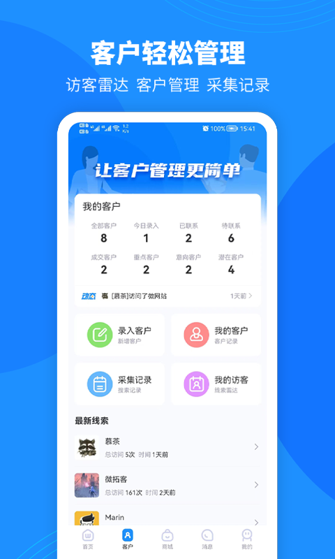 通过客源采集/营销素材/获客应用商城,帮助中小企业主及业务人员实现快速获客、精准营销、成交转化的商业诉求。从而改变传统获客模式,利用互联网把公开合法数据整合在一起,为销售业务人员提供大量优质客源。目前,微拓客已覆盖家装、建材、美容、保险、金融、房地产、电商、服装、医药、保健、汽车等300+个行业品类客源数据。软件功能包含:关键词客源、附近客源、行业客源、工商查询、运营商客源、同城人脉、最新企业、美团客源、企业黄页、百度客源、抖音客源、微信客源、我的名片、微网站、获客海报、获客视频、获客文章、视频去水印、商学院。微拓客更新日志: