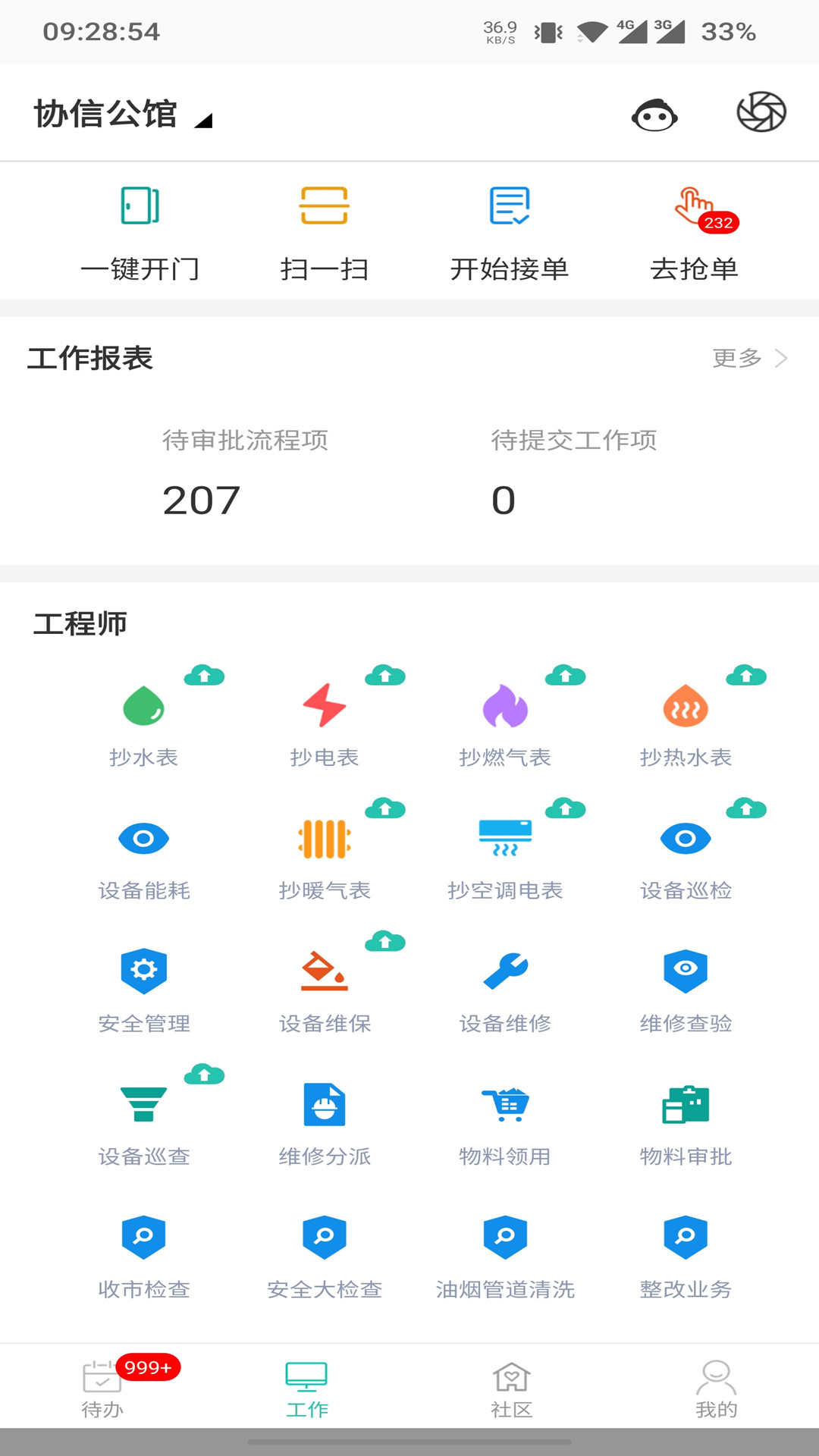 4、查看工程师的工作信息,并统一管理,提高工程师的工作效率,让办公更便捷,给业主全面的生活服务;