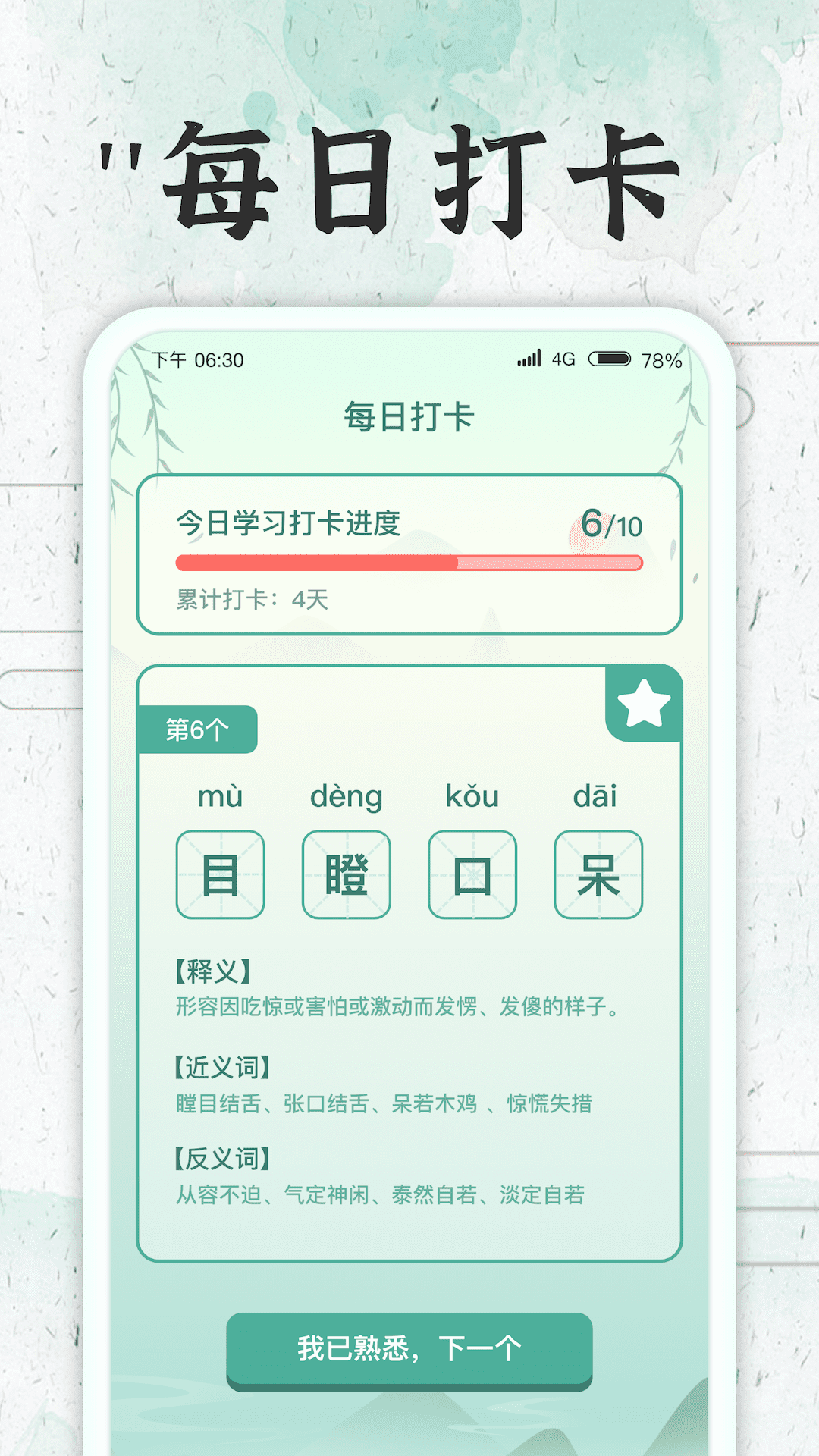 【成语牛人】通过不断的打卡学习,用户能不断地增长自己的成语学习能力,应用内包含对成语的详细解释,用户能通过打卡学习、看诗词学成语等方法巩固所学的知识。