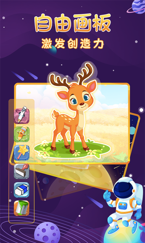 【趣味自由画板】空白的纸张让宝宝的想象力在上面自由挥洒,不同的笔刷带来不同的质感,各式各样的印章给绘画带来了更多乐趣,超多颜色选择,提高宝宝对颜色的感知力。