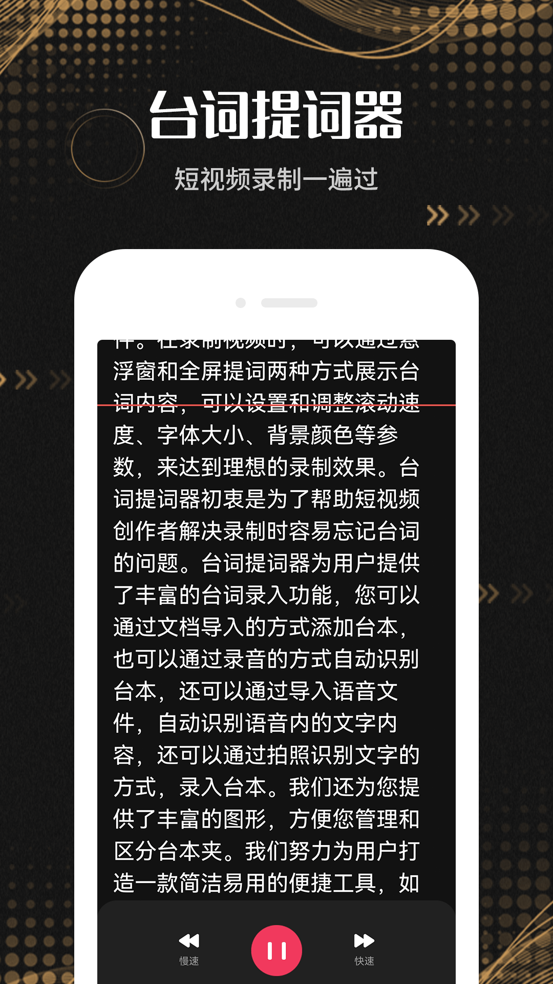 【台词智能管理】支持文本录入台词、音频文件转换文字录入台词、拍照识别文档文件录入台词、录音转文字录入台词、文本文档导入内容录入台词等多种方式。台词分文件夹管理,可以设定专属图标,清晰明了,还可以在录制的过程中随心切换台本夹。【提词板模式】可以支持提词板模式滚动台词内容,同时支持调整字体大小、字体颜色、背景颜色、滚动速度、字体间距等参数,让您在短视频录制过程中调整到一种佳的状态。