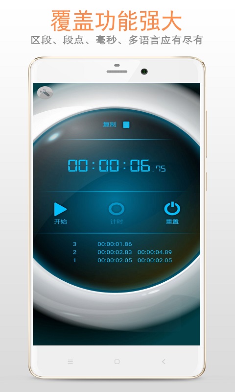1、支持分区段时间(Lap)和分段点时间(Split)模式计量流逝的时间,现代实用;