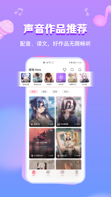 【暖柚 Sora】暖柚 Sora为你提供了众多个性化的声音内容,可以聆听配音、歌声、PIA、原创等达人演绎的声音内容,海量的声音频作品,随时随地都能分享倾听。【我的小窝】我的小窝可以随时管理你的声音内容,查看聆听他/她的声音演绎,为声音达人打call。