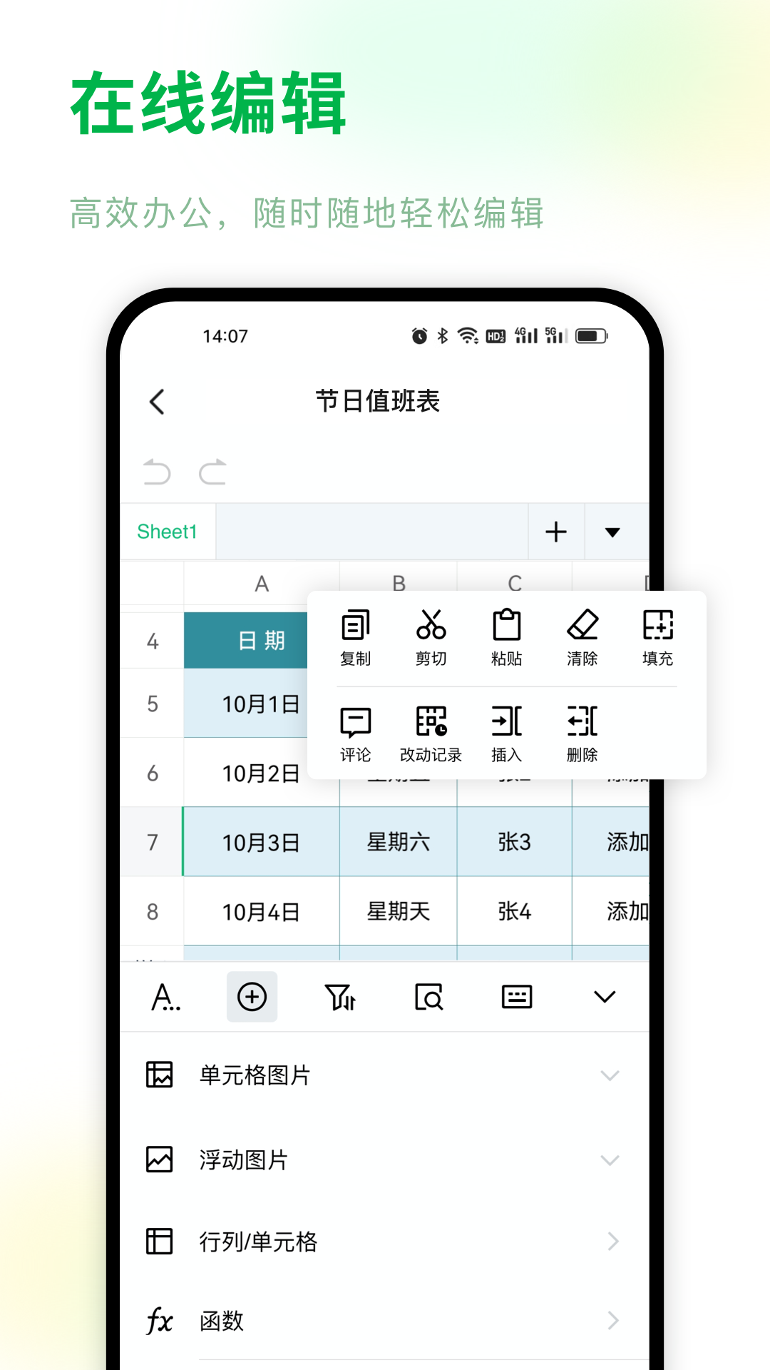 Excel电子表格编辑是一款手机在线编辑xlsx表格软件,帮助您轻松制作excel表格xlsx表格,快速学习和掌握xlsx表格,Excel办公软件的好工具。编辑excel表格,xlsx表格,不受办公室和教室限制,随时随地excel办公学习,让你随时随地都能创建、查看、编辑、分享Excel,轻巧便捷的xlsx表格制作,excel表格制作工具,提供多种excel表格模板,xlsx表格模板,满足办公需求,强大的文档管理功能,有效管理工作内容。 财神爷站提供手机表格制作软件app官方版下载地址,有需要的用户可免费下载使用!