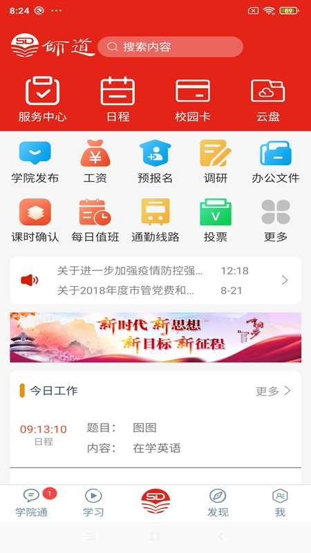 提供工作台应用,包括工资查询、值班、日程、投票、通知、审批、投票等常用的办公和服务,为企事业单位和各个学校提供移动办公的服务平台。