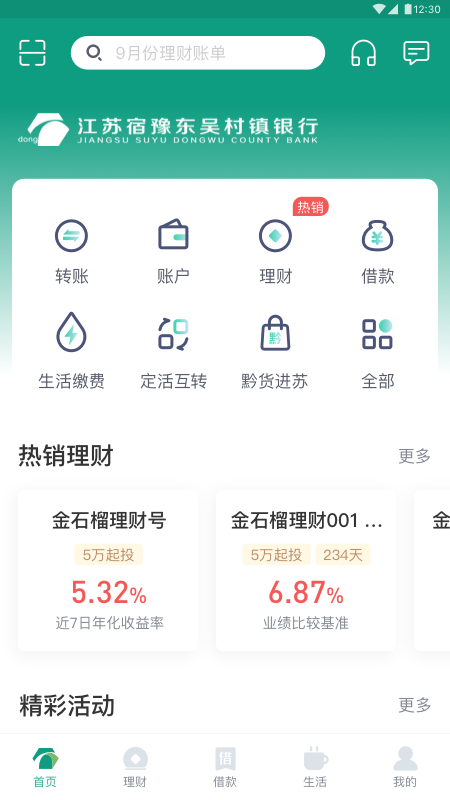 账户一览、交易明细、智能转账、苏式理财、智能储蓄、个人贷款、资金归集、网点预约;