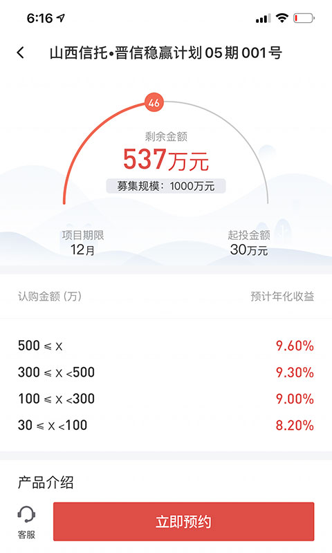 支持用户在线预约信托产品来进行认购投资,点击立即预约进行预约操作即可