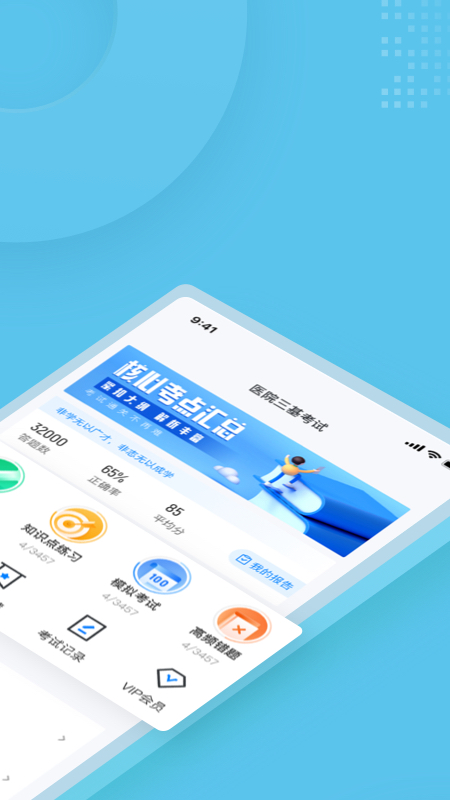 [多样式的刷题模式] 医院三基题库内含考点练习,全国通用卷以及地区卷模拟练习,以及按照固定考试比重的随机式的抽题的真题考场,成绩单实时记录考试数据,一点一滴的反馈考生近期学习状态以及自我正确率的提升,大大的给予考生通过考试的信心。