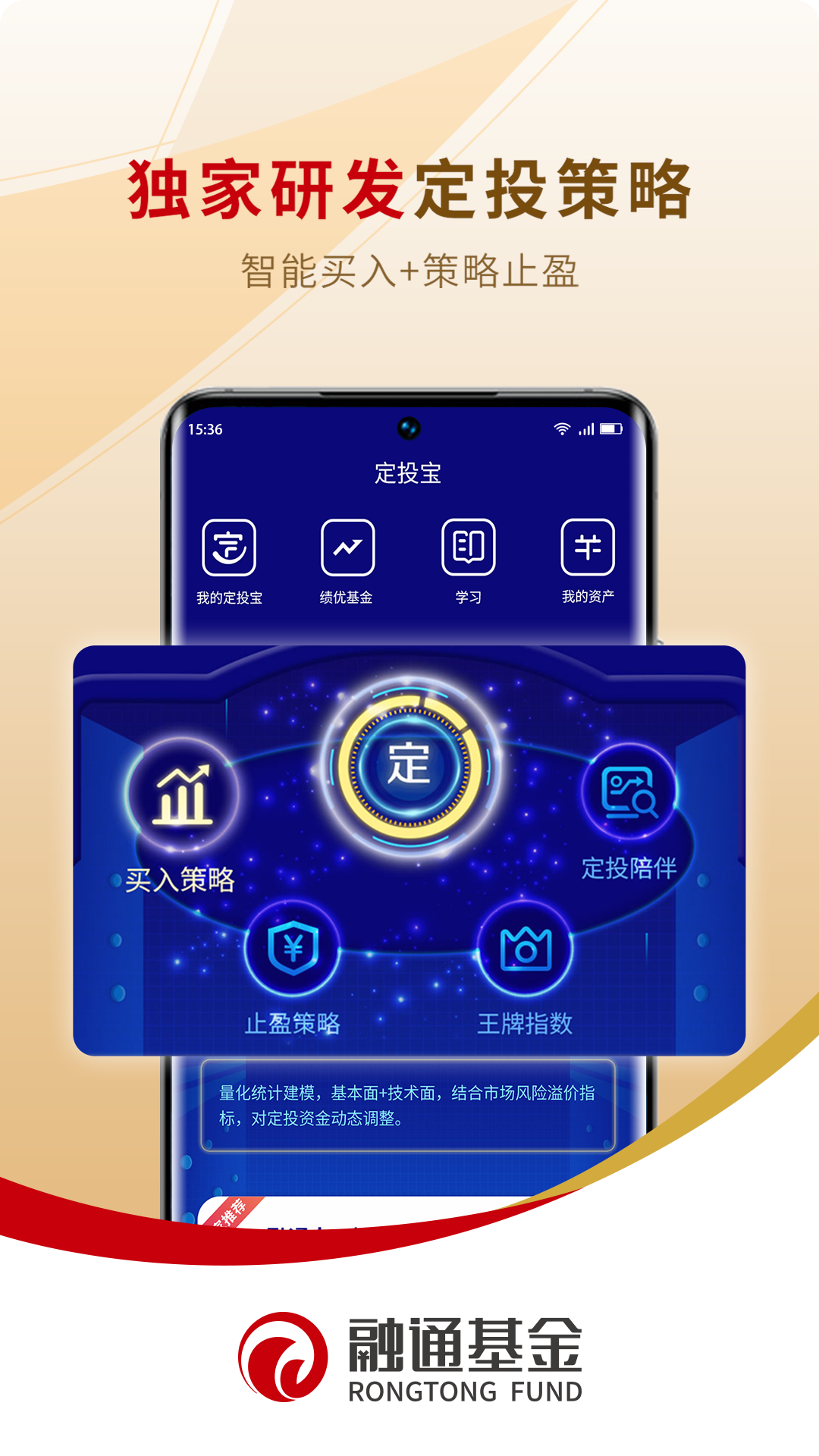 1、专注基金定投:首页设置创新,专注“定投宝”主打产品特色,不走传统基金超市路线。2、智能定投策略:定投宝对接基金为全市场首只跟踪人工智能指数的指数型基金“融通人工智能指数基金(LOF)”,以及全市场首批开通定投业务的融通传统优质指数基金“融通深证100指数基金”,创新采用指数与量化投资部独家研发的“智能买入+策略止盈”定投策略,结合市场风险溢价指标,让用户的定投计划可以更聪明、更省心、更牛!