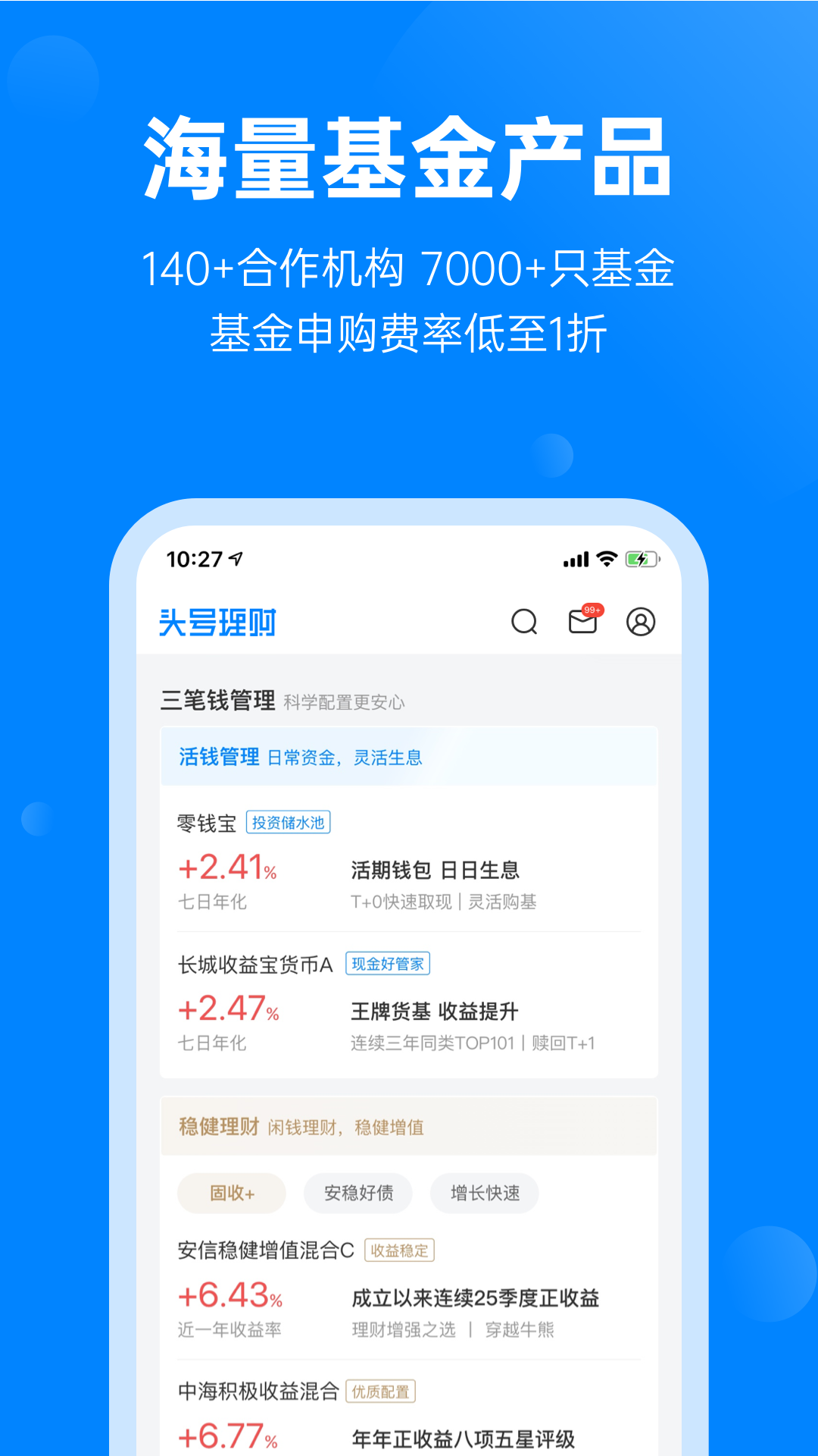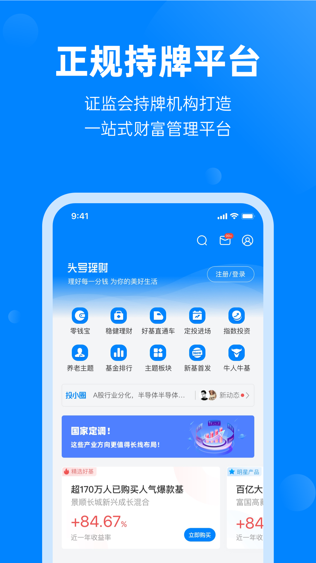 【平台优势】安全可靠:证监会持牌机构打造、民生银行全程资金监管产品丰富:140+合作机构,7000+只基金,申购费率低至1折;简单省心:专业研选、精品服务,陪你实现财富管理目标;贴心陪伴:专业机构与理财达人组团陪伴同行,理财不迷路;【特色服务】零钱宝:申购灵活、天天计息,活期理财好去处;稳健理财:精选固收+好产品,给你稳稳的幸福;好基直通车:严苛筛选好基金,长期投资收益佳;基金定投:多定投计划轻松管理,长期收获时间复利;指数投资:跟踪指数,分享市场与行业增长;养老保障:养老产品精准匹配,提前准备保障退休生活;