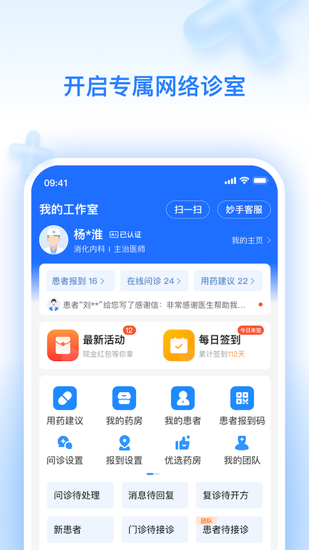 【患者管理】高效患者管理,提高沟通效率,碎片时间、随时随地为患者提供在线服务;妙手医生版具备医生专业性、私密性,是医生管理患者的必备工具。【处方用药】互联网认证医生在线为诊后患者开具电子处方,患者凭处方在线购药,足不出户、送药到家。