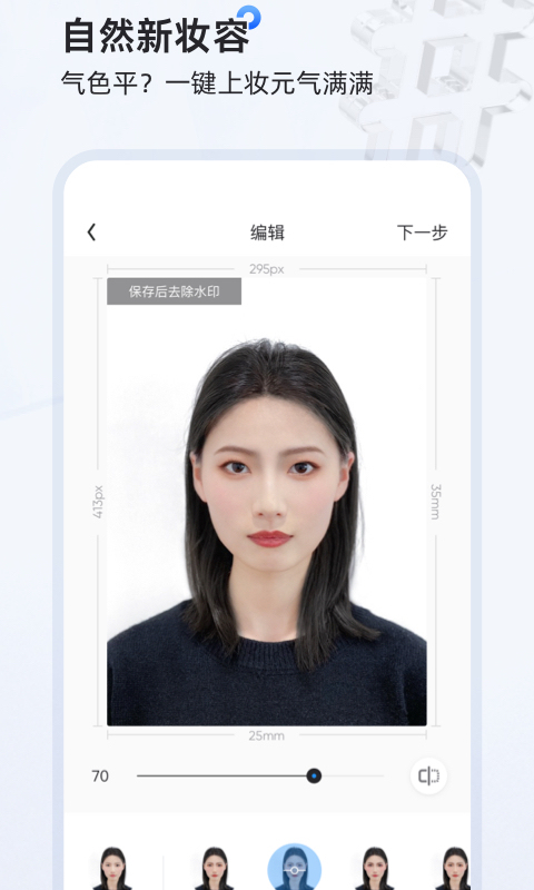 AI一键抠图,背景替换更适应用户只需拍摄或上传照片,即可完成智能抠图与背景融合,配合符合规格的多种背景底色,不仅可根据不同的使用场景随意切换尽显专业,更可以较小的成本帮助用户找到适合且喜欢的背景色。精细化美颜,焕发更美自我 AI智能算法提供磨皮、美白、五官立体等美颜功能,更有一键变美的换妆功能,满足你对多种妆容的审美需求,还保留支持自定义程度的选择。帮助用户找到更容光焕发的自然容貌,告别证件照刻板印象,展现美好状态!精美服饰在线换,不受着装限制没有符合证件照需求的服饰不要紧,我们提供了不同风格的男装、女装、童装,满足证件照所需的正式需求的同时,还能拥有大量的精美选择。支持自助调节服饰大小和位置,让服装更贴合自然!证件照 研习社更新日志: