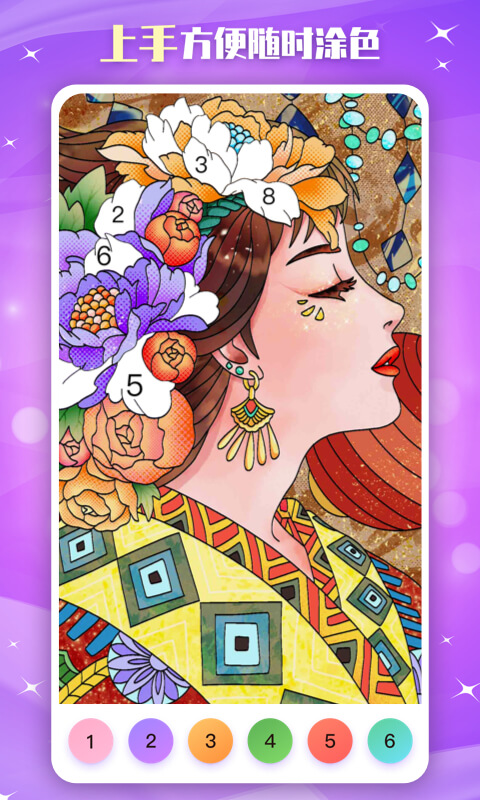 【操作简单】 随时随地都可以进行数字填色创作,按提示涂色,轻松完成与众不同的艺术绘画作品。