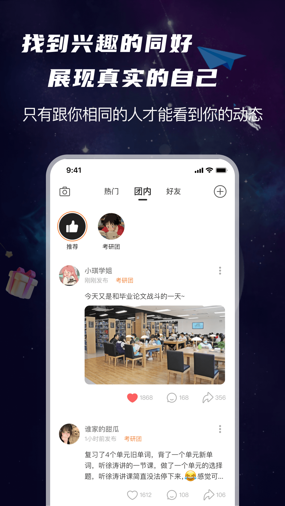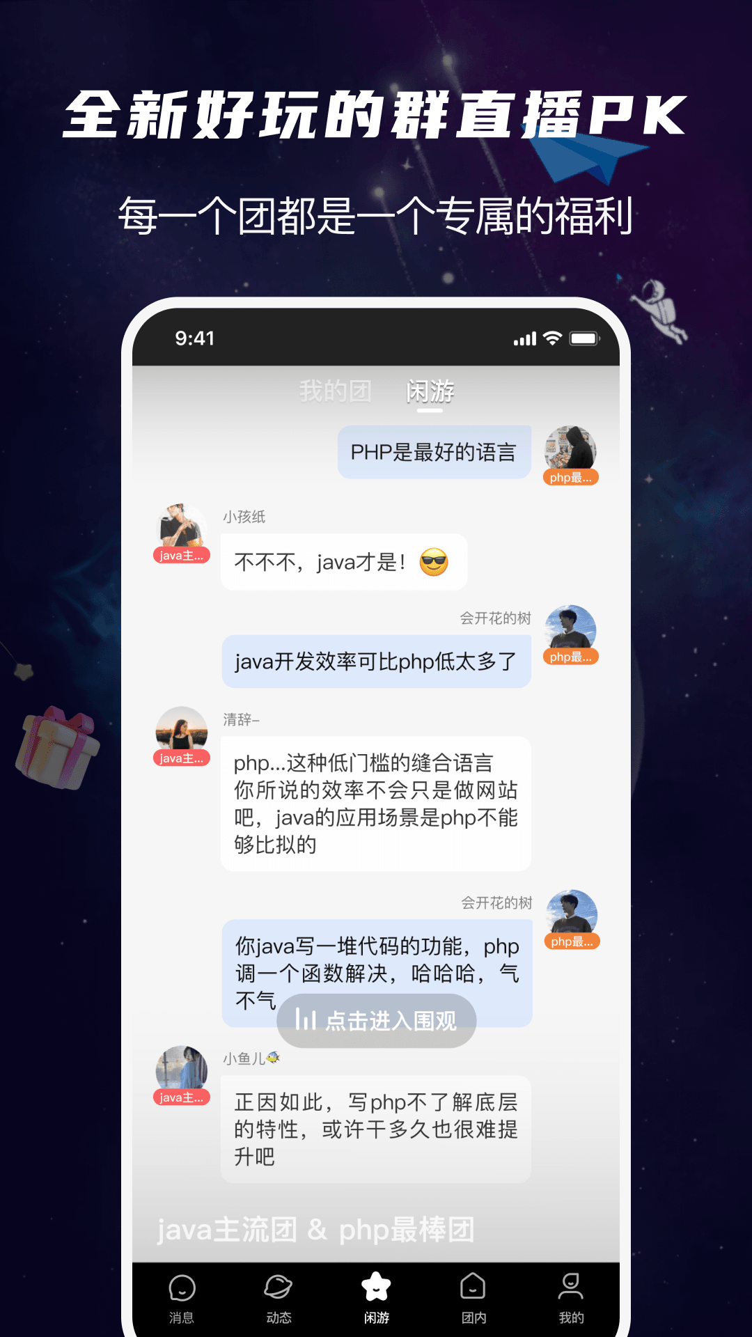 团宇宙是一款以群交友为核心的社群社交APP,致力于让每一个人都能找到让自己放松的圈子,哪怕你喜欢的东西小众,冷门,也可以在团宇宙里找到相应的团,也能玩得很开心。让每一个夜晚都能有人说话,让这个世界上懂你的人集合到一起,让无穷的远方,理解你的人们,能和你互相抱团。打破信息茧房,让不同的群体可以在一定时间内结合到一起,让不同的思想碰撞出激动人心的火花,让围观的每一个人都能获益匪浅,让人类的文明不断前进。 财神爷站提供团宇宙app官方版下载地址,有需要的用户可免费下载使用!