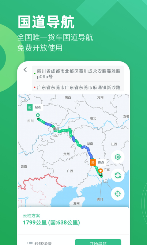【国道导航】 全国独家货车国道导航,免费开放使用,专注于为货车司机规划更省钱,更好走的路线!