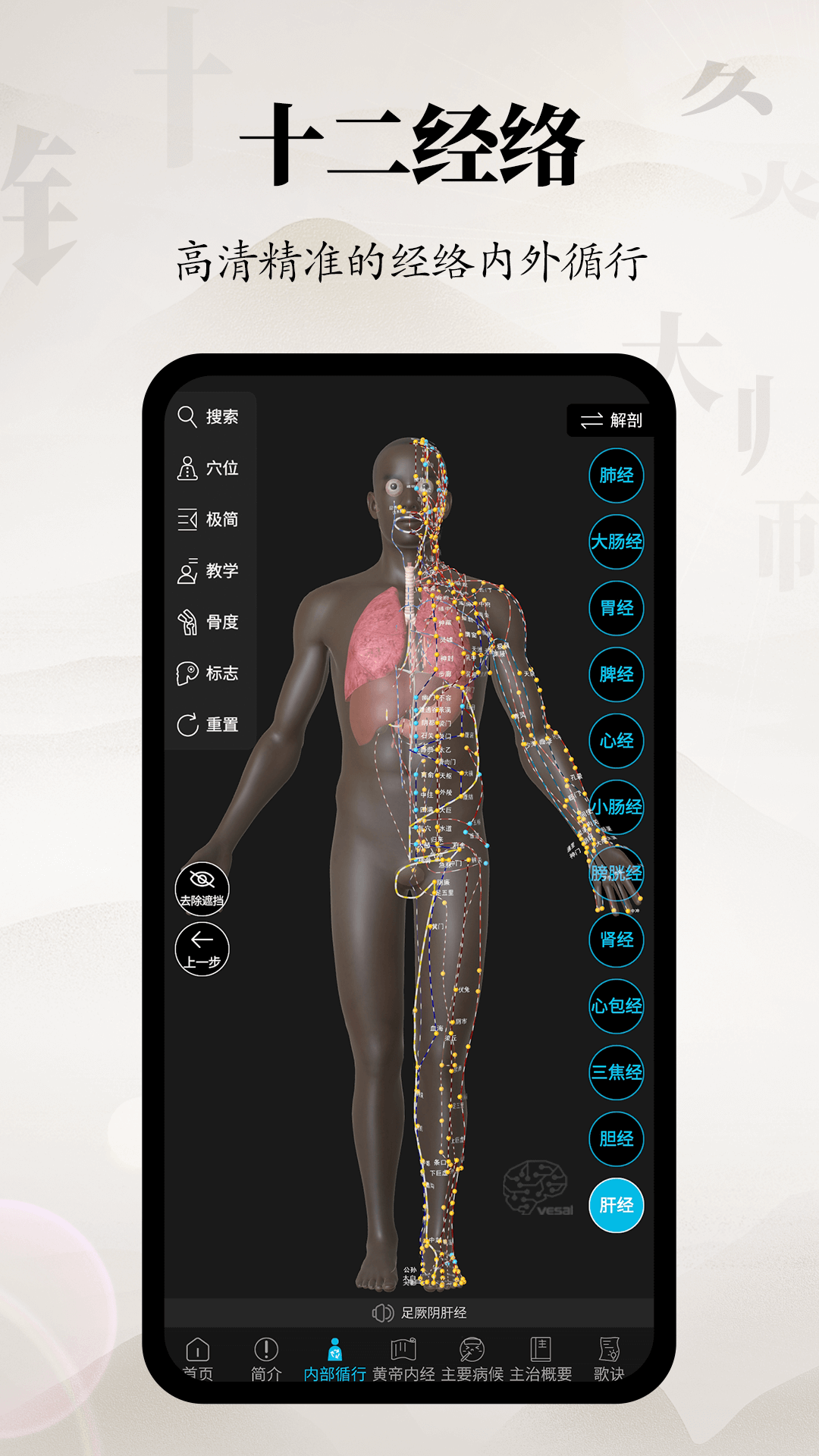针灸大师软件将经络腧穴与3D人体解剖相结合,交互式学习十二经络,奇经八脉,经络系统等知识。提供穴位检索、定位进针示范视频和腧穴剖面图谱,针灸模拟练习,是您学习中医针灸的得力搭档。软件是由中国西安维萨里数字科技有限公司研发的一款3D可视化、立体化、动态化的针灸经络学习软件。本软件将针灸学与人体解剖完美结合,在人体模型上精确、完整地显示了十二经络,奇经八脉,经外奇穴等内容。产品内容通过针灸医学专家团队的严格审核,是中医从业者、医学生、针灸养生理疗、中医研究、推拿按摩、艾灸拔罐、中医科普工作者必备的学习工具。财神爷站提供针灸大师app官方版下载地址,有需要的用户可免费下载使用!