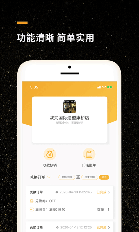 1、查询兑换订单,可以自主选择开始日期以及结束日期,快速筛选;2、可以直接浏览全部的账单,按列表依次浏览,实时进行核对;