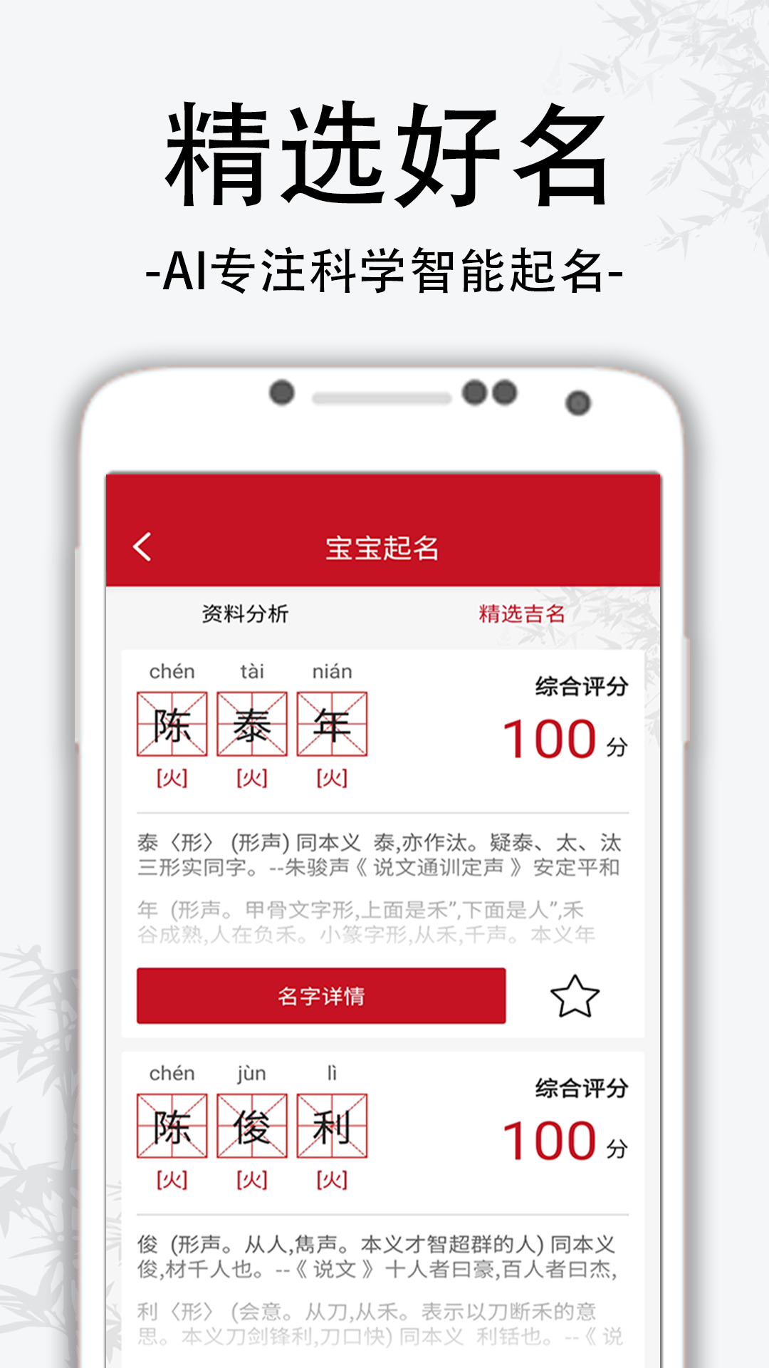 【美名分析】 一个好听吉祥的名字往往能给大家留下美好的印象,因此准爸妈们在给宝宝起名字的时候,都讲究好听悦耳。而一个有寓意的名字又能体现出宝宝独有的美,所以如果能给宝宝起个好听又有寓意的名字,对他们今后的生活将有大大的好处。 萌宝宝取名软件通过人工智能AI起名,自选名字、推荐名字、好听名字,多样选择,供您挑选!
