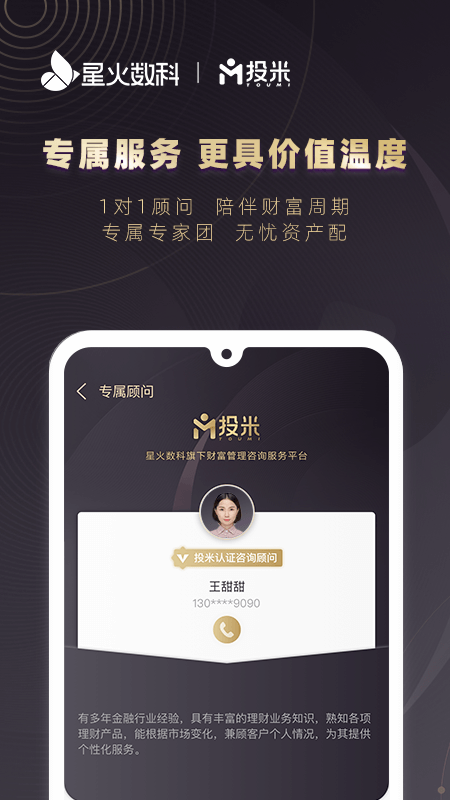 理财师可通过星火理财师APP进行线上化客户管理,而广大客户则可通过投米APP绑定专属理财师,并直接在线上进行交易,一键下单,且可随时享受专属理财师的专业服务指导。通过多年的技术沉淀,投米APP建立了一整套前沿的数字化财富管理支持服务架构,包括:智能KYC系统、智能资产配置选择工具、智能语音客服系统等,为理财师及其客户提供资产配置信息发布、信息展示等中介服务。投米更新日志: