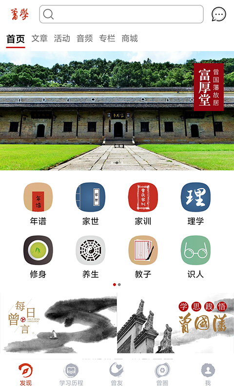 “曾学”将曾国藩的著作思想内容按类分为16大栏目,供曾友学习品读;首页展示有实时更新的学思践悟曾国藩的文章与每日曾言版块,便于曾友利用碎片时间阅读;同时设有曾友专栏、文章、音频、等版块,曾友可以在其中分享自己的思想体悟;在活动版块,曾友可以参加官方发布的线上、线下活动,也可以申请发起有意义的活动;同时我们设立了曾圈功能,使用者可以在这里与曾友分享、交流;在商城中,上架曾学文创产品。欢迎加入[曾学],与曾友分享交流。我们的官方公众号:学思践悟曾国藩曾学更新日志: