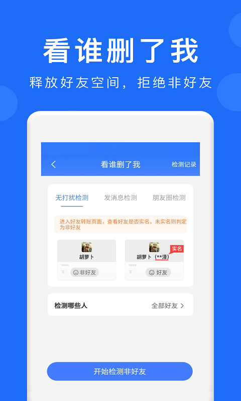 5.支持检测已经删除或拉黑了你的好友,对其他好友无打扰,无风险,支持备注和删除;