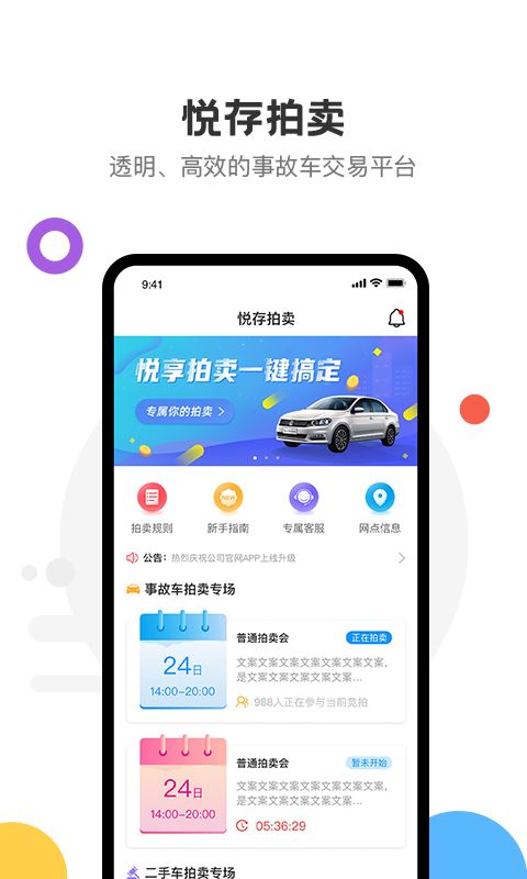 悦存拍卖软件特色所有的车辆都是经过了360度无死角拍摄,你想要看什么位置都有提供价钱标注十分详细,哪里有问题都会在标注上面自己可以看一下选择适合自己的二手车,就相当于是醇了一次羊毛一样的哦。
