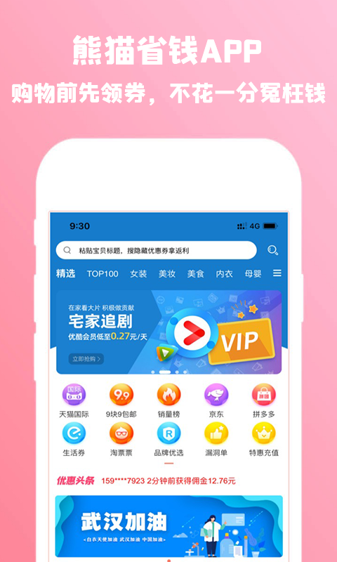 【购物领券再享返利】购物之前用熊猫省钱搜隐藏优惠券,下单后还有高达90%的现金返利,快速到账;
