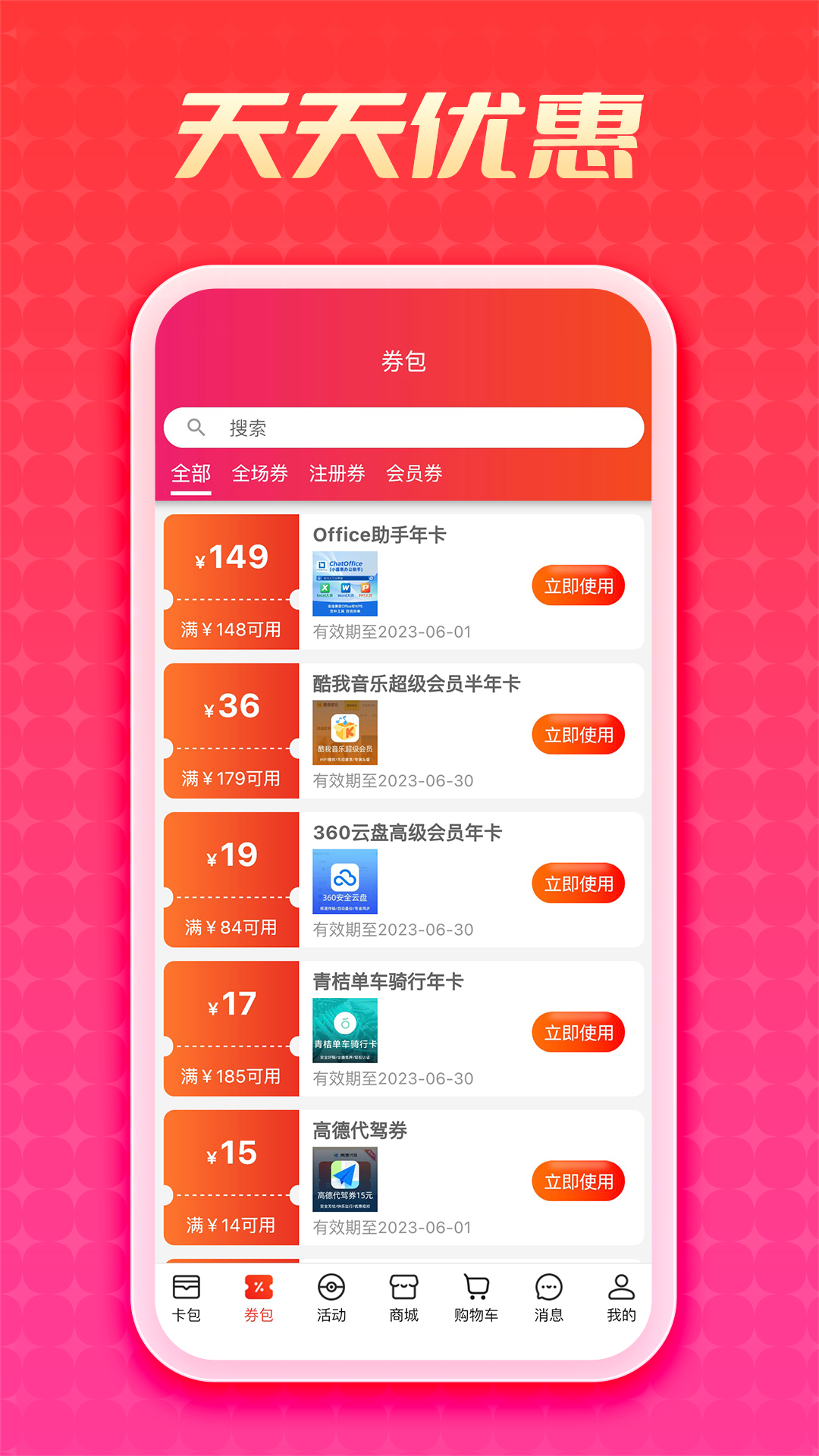 用户可以使用“卡包”功能进行一键充值、优惠券使用、二维码展示、商品跳转、自定义功能栏、联系客服等操作,同时提供身份证、名片等实体卡转虚拟卡功能。为用户提供全新、好用、便捷的卡包功能。