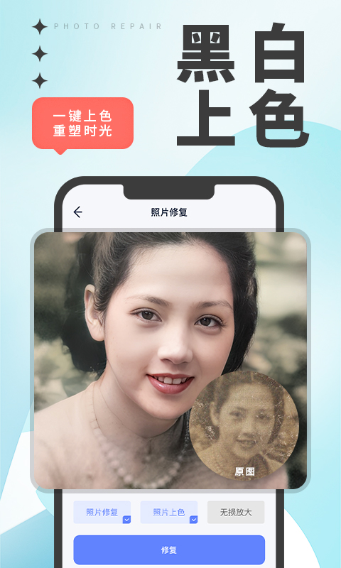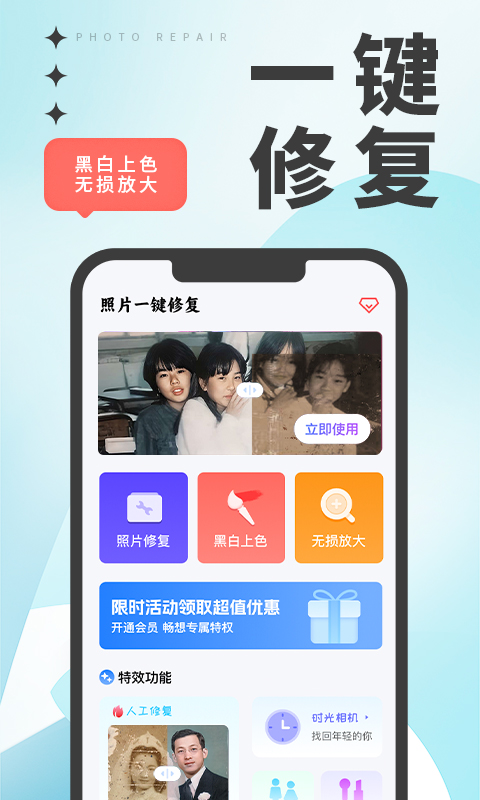 照片修复:通过先进的人工智能技术,可以轻松修复老照片上的划痕、折痕、模糊和斑驳,让您的照片焕然一新。