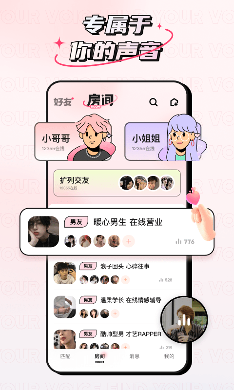 在线实时语音,不同风格的语音房等你加入,更多小哥哥小姐姐在线聆听你的声音