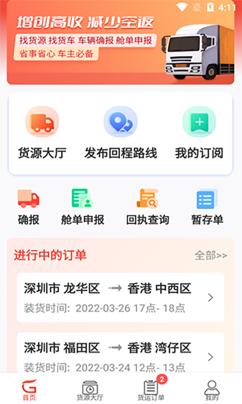 助力中港陆运回程车运输,为车找货、为货找车,实时更新货源信息,随时随地找货赚钱。江源e启运拥有丰富的货车司机与货主,利用高效平台机制来降低中港运输返程车、回头车的空驶率,主动帮助车主和司机降低运营成本,提高单车运力和运营效率,同时提供给车主和司机运输工具确报、舱单申报、回执查询等自助服务,是车主司机值得信赖的中港陆运配货、跨境通关一站式平台。是一款用于中港陆运吨车运输物流配货、寻找中港运输货源信息、发布中港陆运回程车源信息、自助运输工具确报、舱单申报、回执查询的软件。 财神爷站提供江源e启运app官方版下载地址,有需要的用户可免费下载使用!
