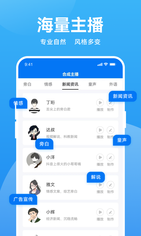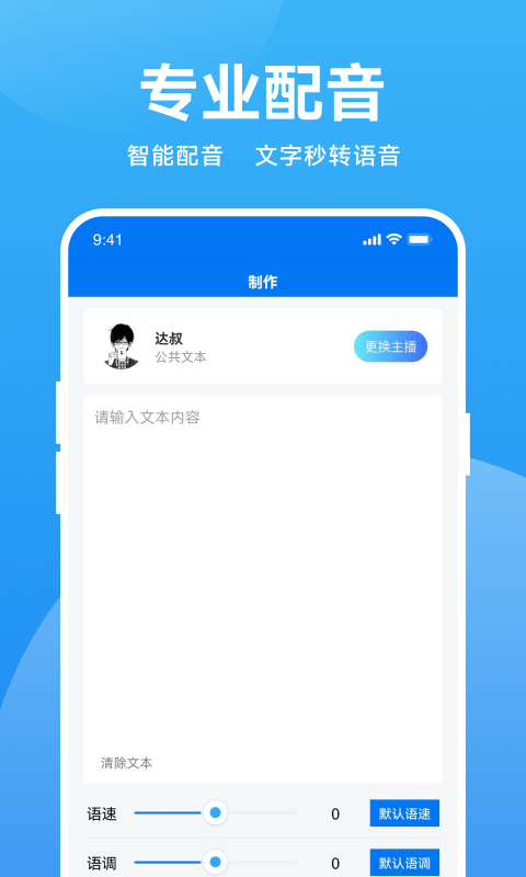1、智能配音:输入文字秒变语音,上百种音色可供选择,支持音量、语调、语速调节