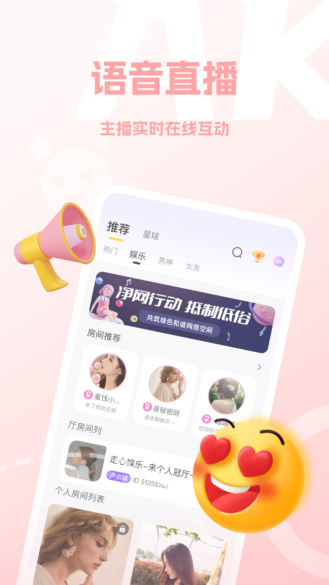 2)语音交友:语音连麦交友,多人语聊正在等你连线,多样化的交友房间,通过声音结识更多有趣的灵魂。