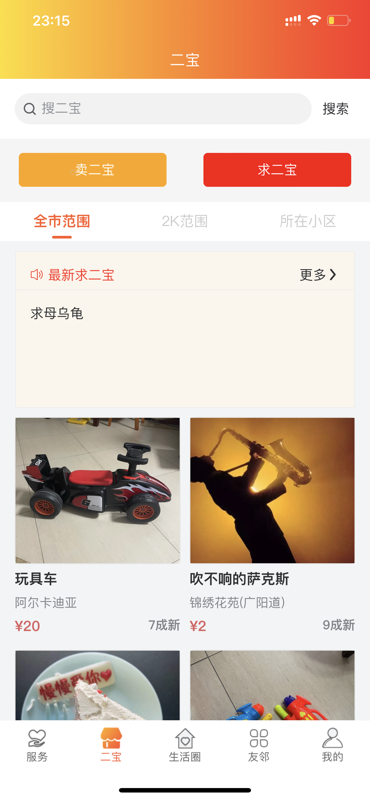 1:利用卖二宝,将留着不用,弃之不舍闲置物品在邻里之间交易。
