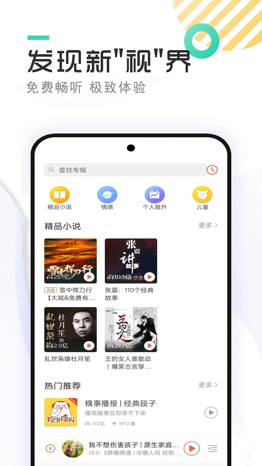 解放双眼,随时随地聆听世界的声音!不需要烦心等待,完本+免费,一次听个够!给你无毒绿色的听书环境,用耳朵享受有声读物的快乐!国内齐全有声资源, 数十万部儿歌儿童读物、百家讲坛、评书曲艺、广播剧、脱口秀、笑话段子、音乐、亲子教育、人文历史、商业财经、文学名著等,全精细完美的分类,全优质专业的内容呈现,全懒人的听书方式,爱听什么就多听什么,全酷的听觉享受,让你身临其境,探索有声世界的喜马拉雅高峰。 财神爷站提供免费听书小说大全app官方版下载地址,有需要的用户可免费下载使用!