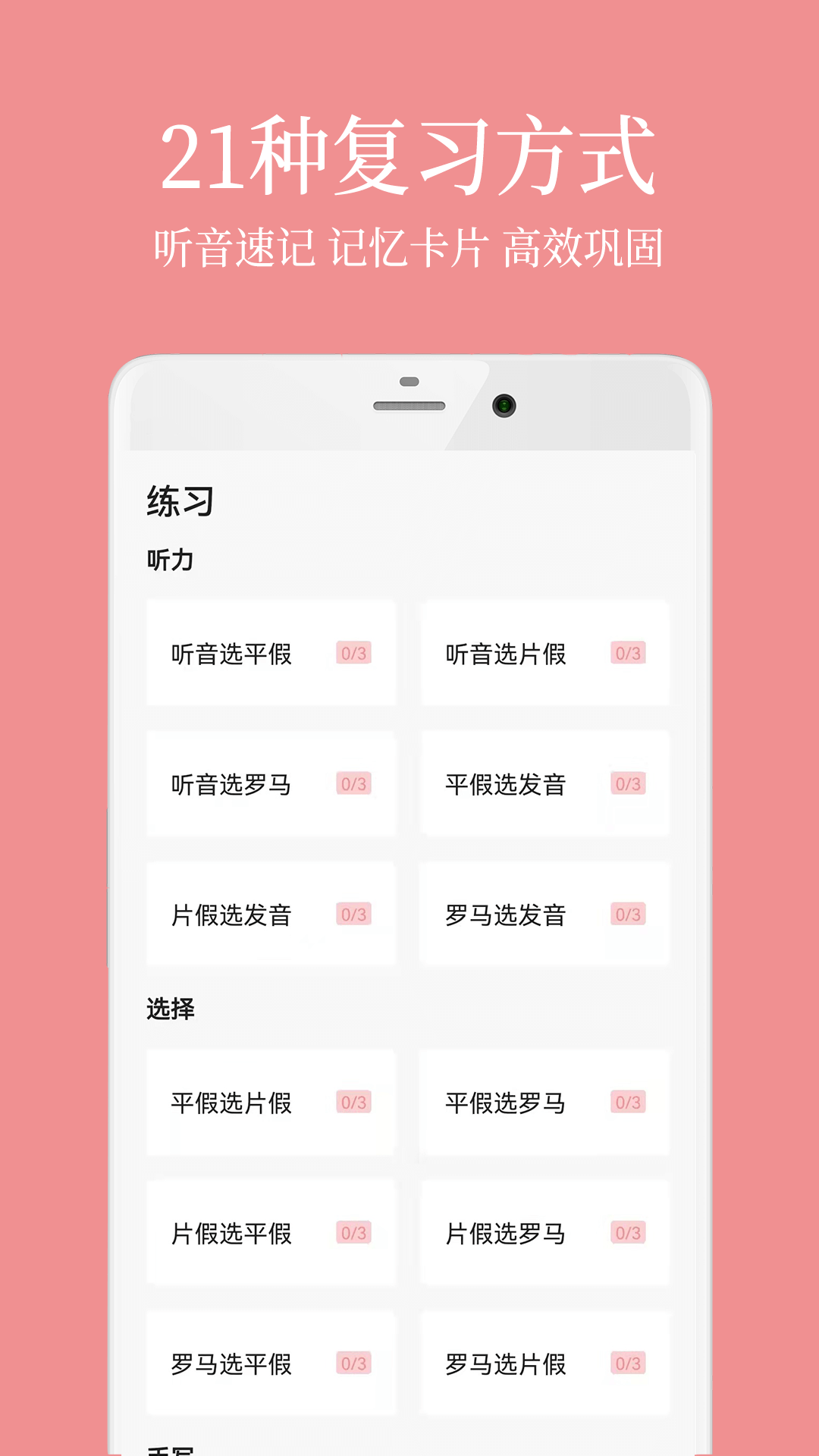 【记忆曲线学五十音】制定五十音学习计划,记忆曲线自动安排复习。多达21种五十音复习模式,让五十音记得更牢固。【中日互译】中文和日语互译,翻译结果有假名标注和词性标注,并可进行发音。
