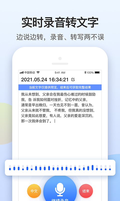 「实时录音转文字」:一键录音转写,在线实时预览,语音识别、语音听写,支持外部导入音频转写文字,操作简单,快速识别;「中英文实时对照翻译」:语音在线实时翻译,语言自由切换,保证文字转换准确度