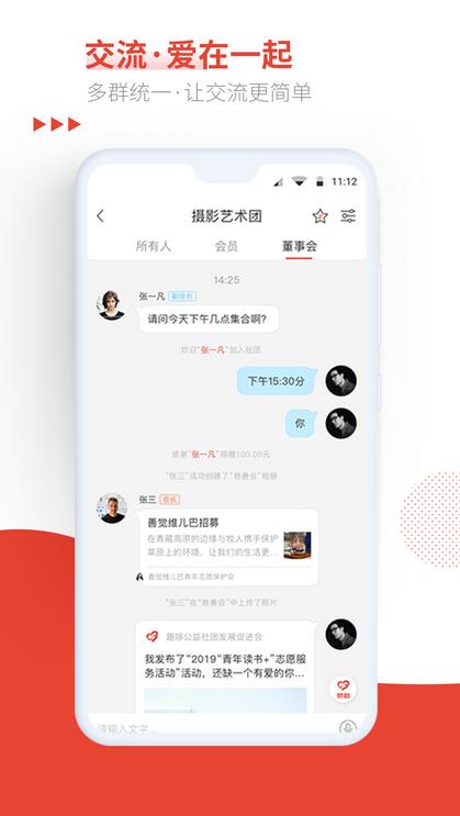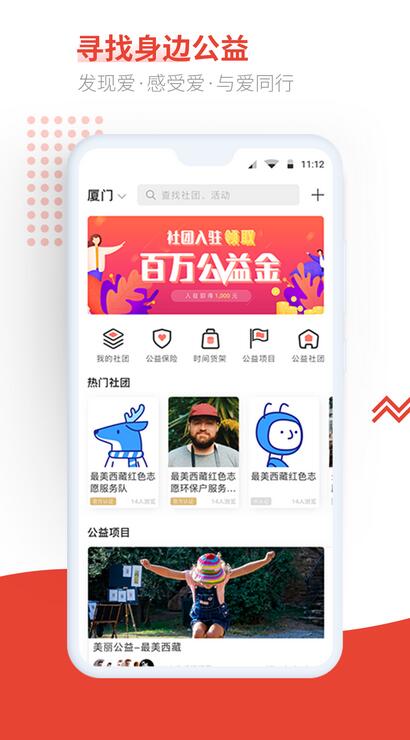 公益服务:提供社团招募、周边公益服务、签到、统计、一键求援、感谢语等实用功能;