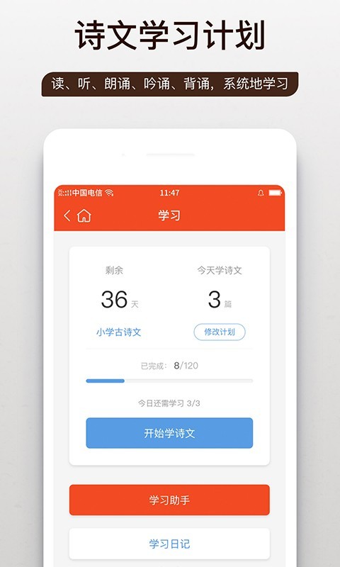本平台提供多维度学习古诗文的功能,根据需求制定学习计划,通过学习助手随机学习。学习的功能有阅读诗文内容、注释、译文、赏析,朗读诗文,吟诵诗文,读赏析,背诵诗文。