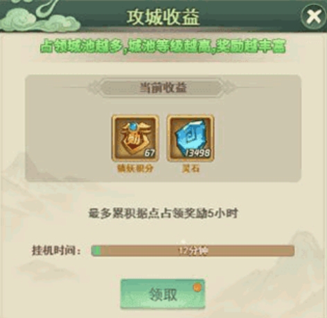 8、攻城挂机收益,当占领的城池越多,城池等级越高,奖励也会更丰富,最多可累计挂机收益5小时的奖励;