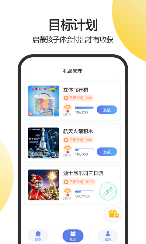 点击礼物发放,按照孩子达到的积分,给予孩子积分奖励,让孩子体验有付出就有回报的乐趣。