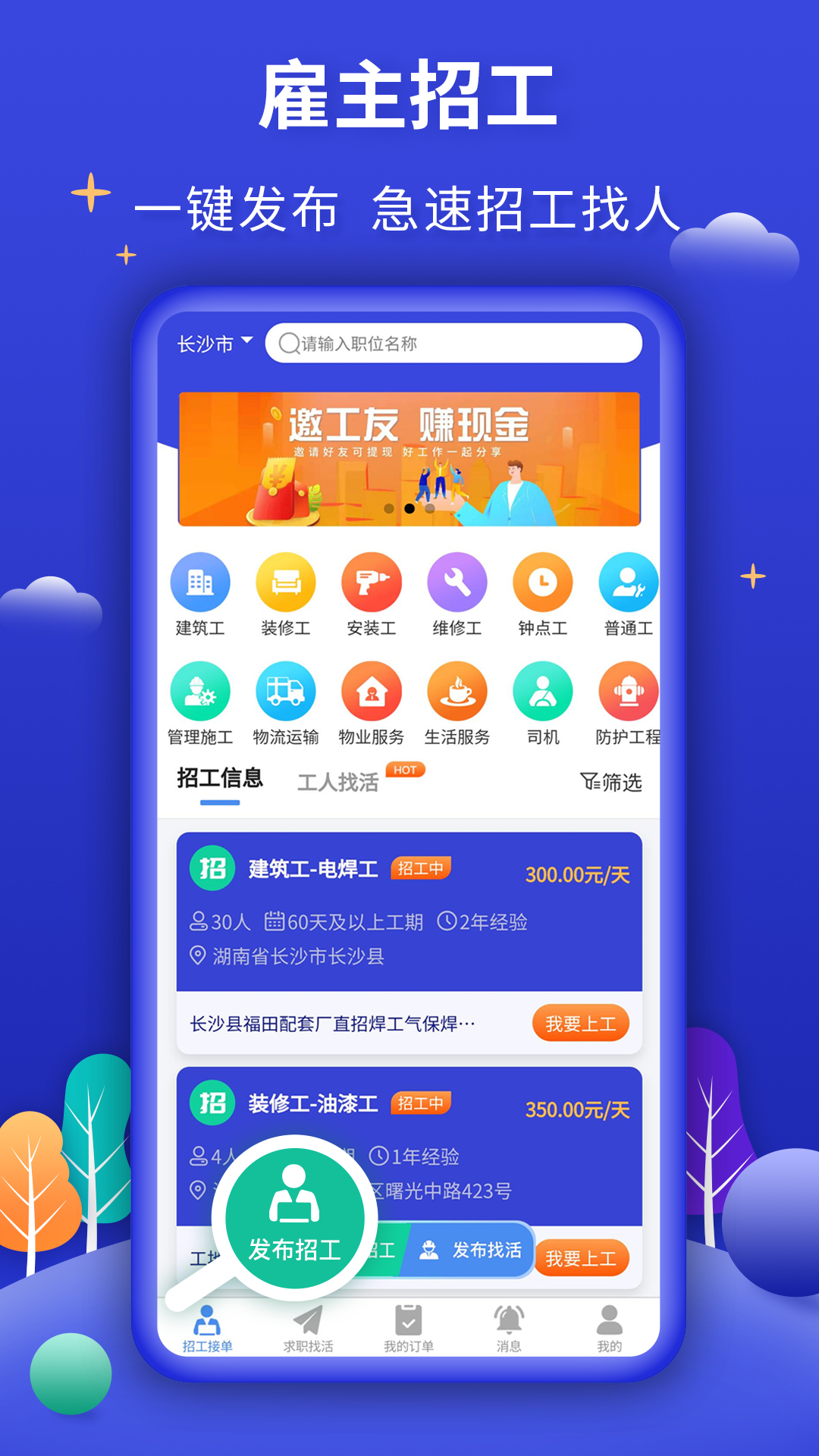 2.一键发布招工、找活,方便快捷,招聘者的贴身之宝,让找工人从此就是这么方便,工人党的福利、招聘者的助手。
